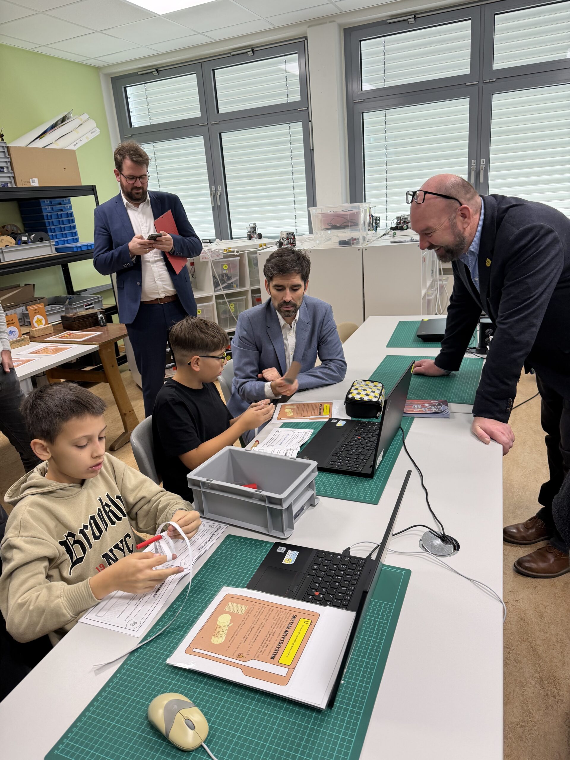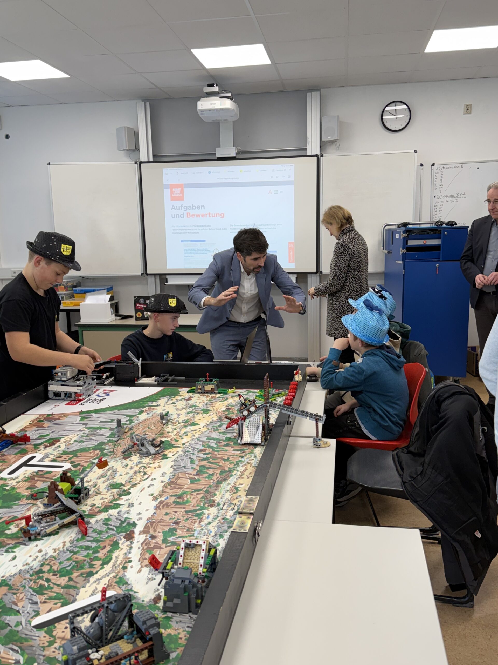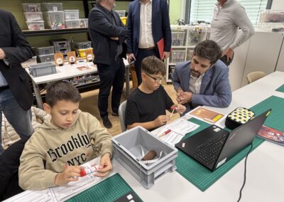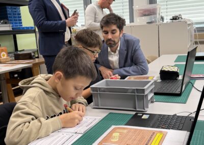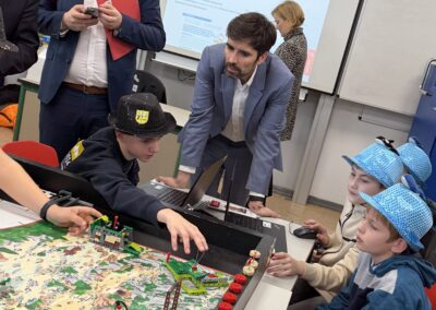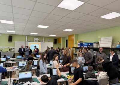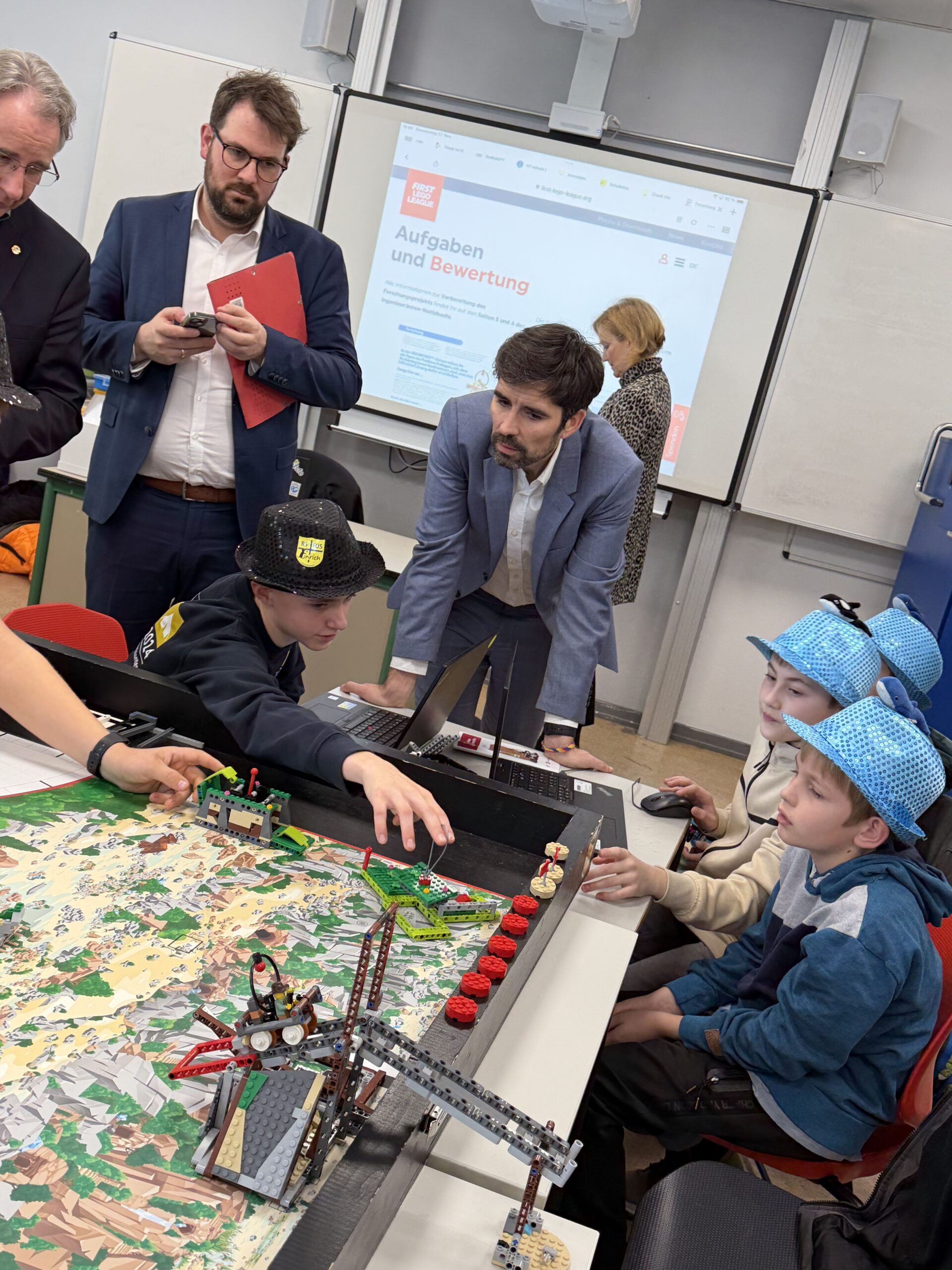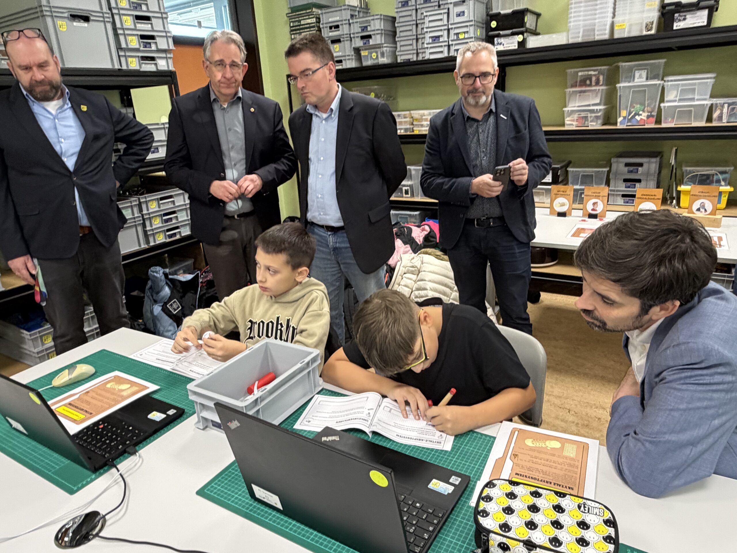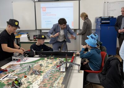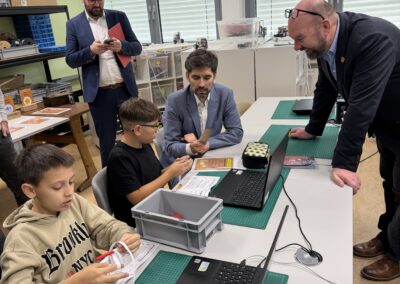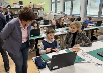 Beim Rundgang verfolgte die Delegation zunächst eine digitale Schatzsuche einer fünften Klasse im Fach Informatik plus. Anschließend präsentierte die Robotik-AG ihre aktuellen Projekte. Auch die Grundschule Katzenelnbogen stellte erste Programmiererfahrungen ihrer Schülerinnen und Schüler vor – Teil der neu eingeführten Medienbildungstage mit Tabletführerschein, Recherchetraining und Präsentationstechniken.