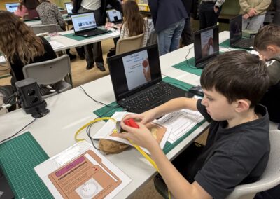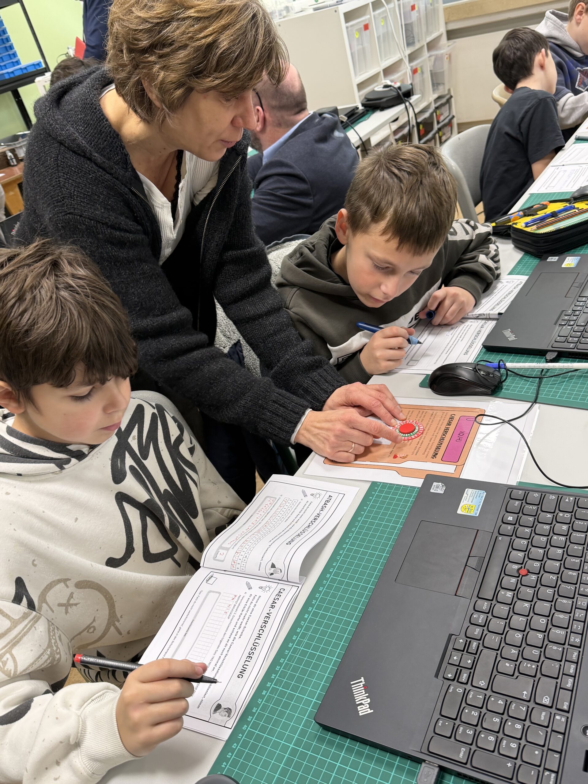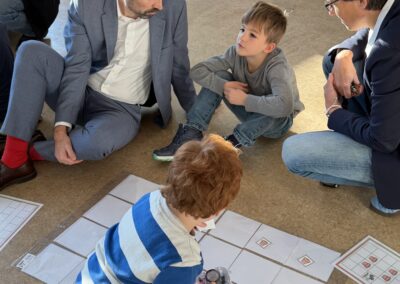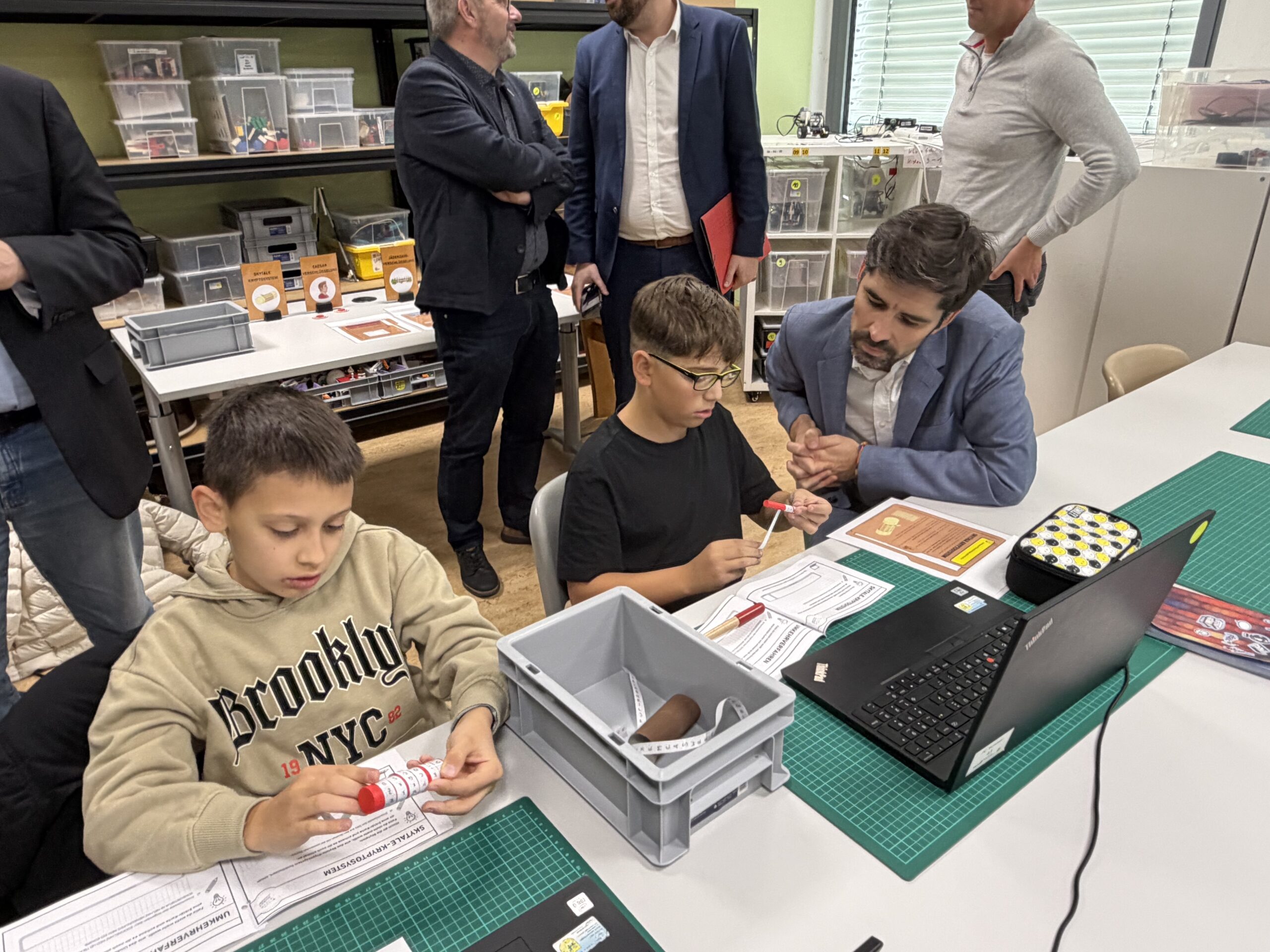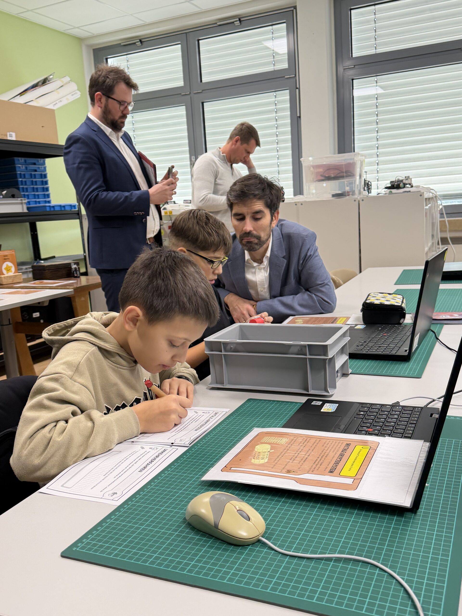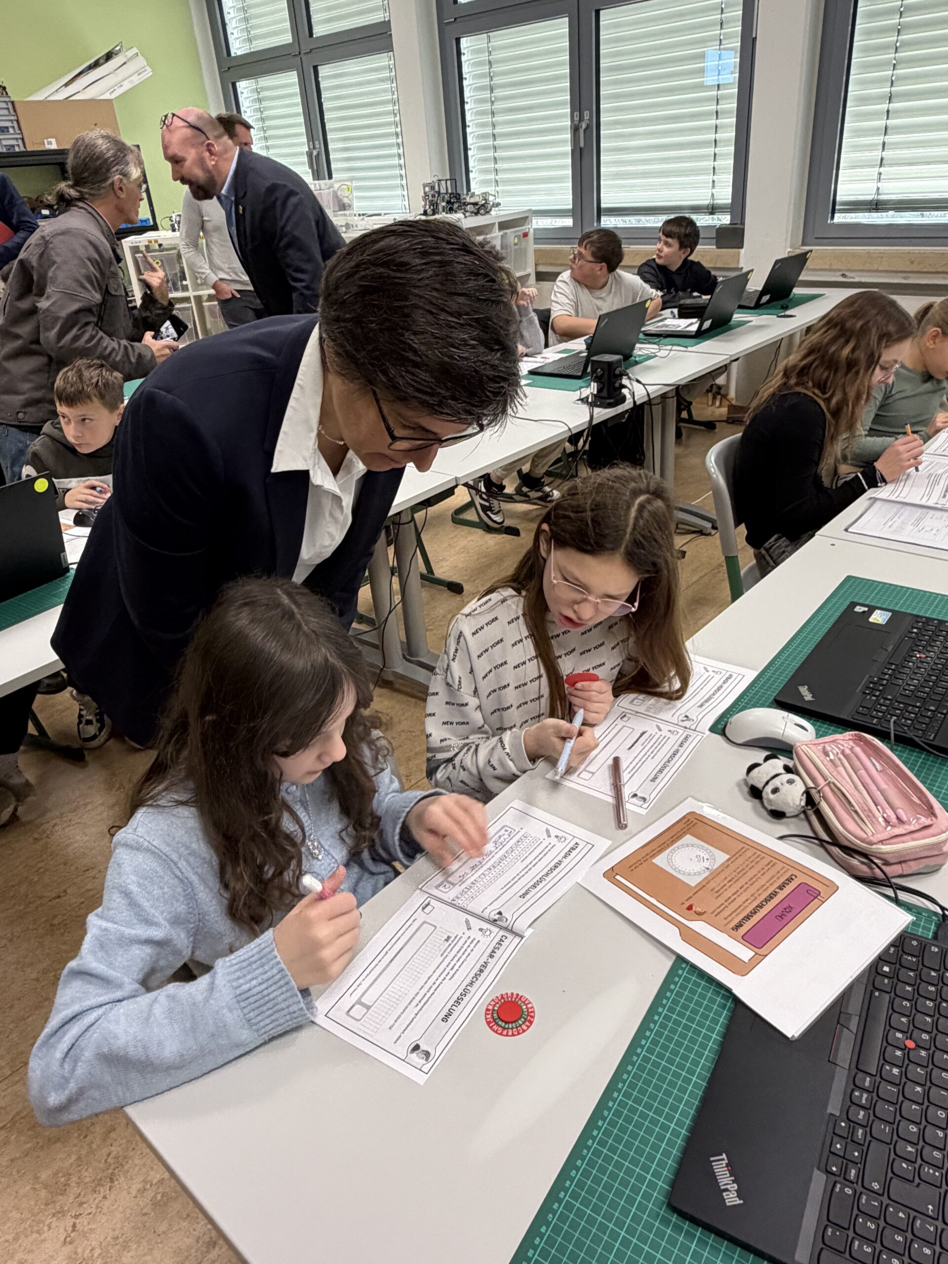 Beim Rundgang verfolgte die Delegation zunächst eine digitale Schatzsuche einer fünften Klasse im Fach Informatik plus. Anschließend präsentierte die Robotik-AG ihre aktuellen Projekte. Auch die Grundschule Katzenelnbogen stellte erste Programmiererfahrungen ihrer Schülerinnen und Schüler vor – Teil der neu eingeführten Medienbildungstage mit Tabletführerschein, Recherchetraining und Präsentationstechniken.